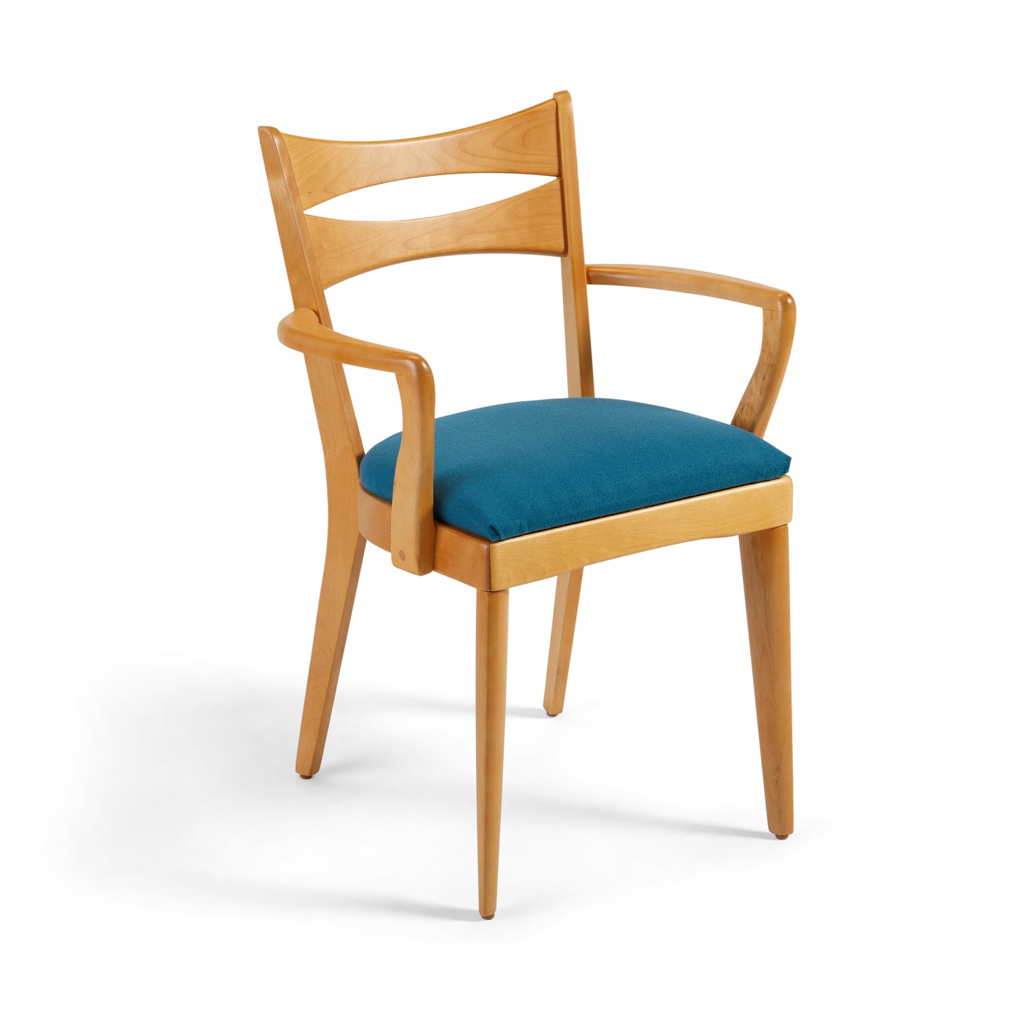 The M 1553 C “Cat’s Eye” Dining Arm Chair conveys a playful elegance that perfectly embodies the mid-century modern aesthetic and Heywood-Wakefield’s hallmark style. It achieves so much character from a deceptively simple design, as well as a versatility that makes it simultaneously well suited to family life, entertaining, and formal dining. It was originally produced from 1956 to 1966.