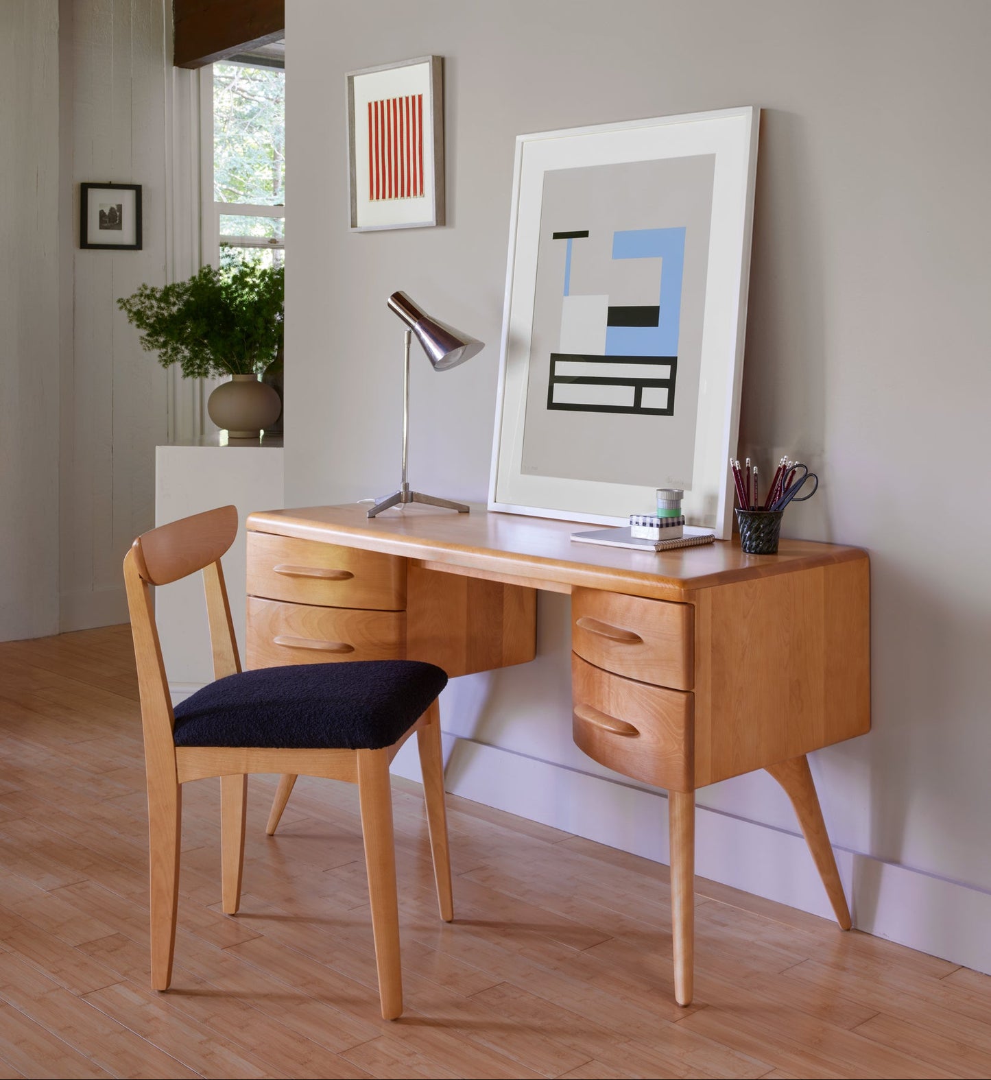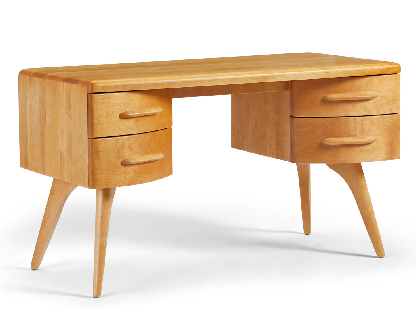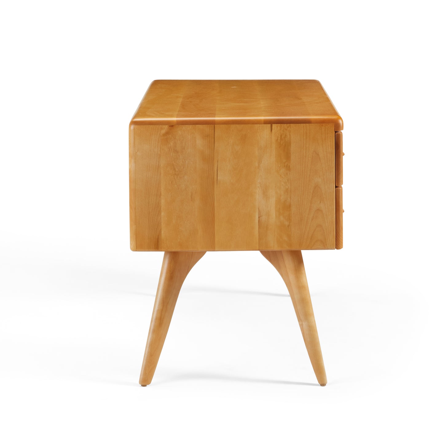 Shown here in our Amber finish, this mid-century modern model, first produced from 1954 to 1956, features four spacious, easily accessible drawers with attractively curved steam-bent fronts. Its simple, streamlined design provides a small footprint for versatile placement and ample leg room for your comfort.