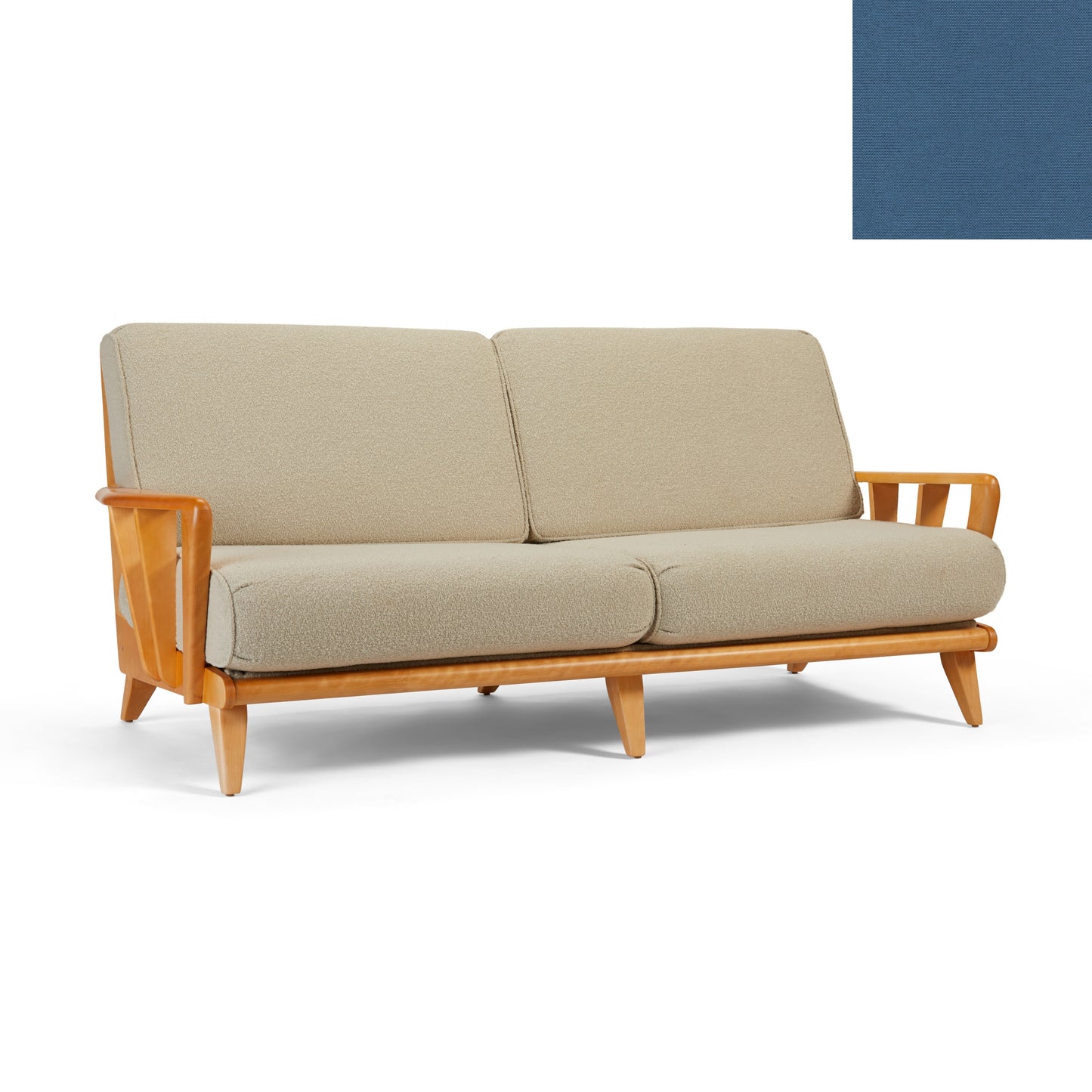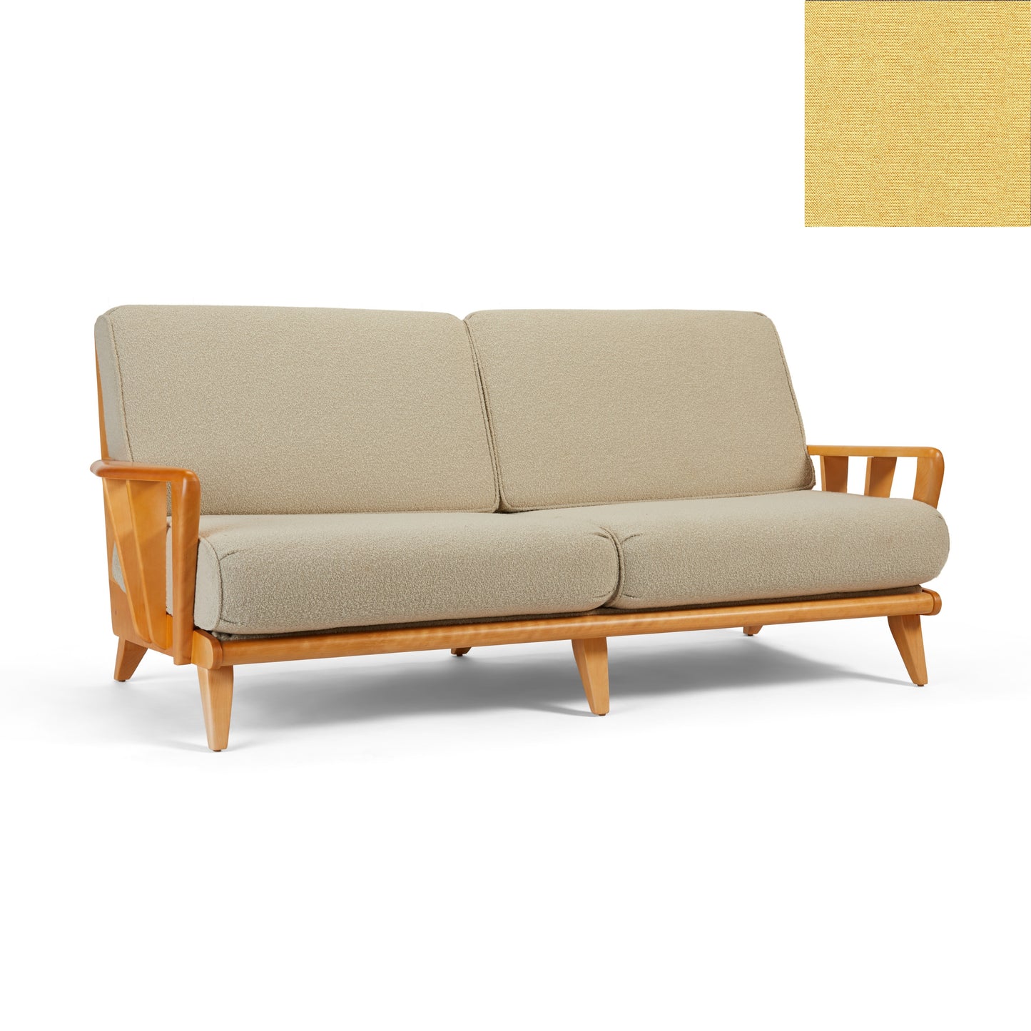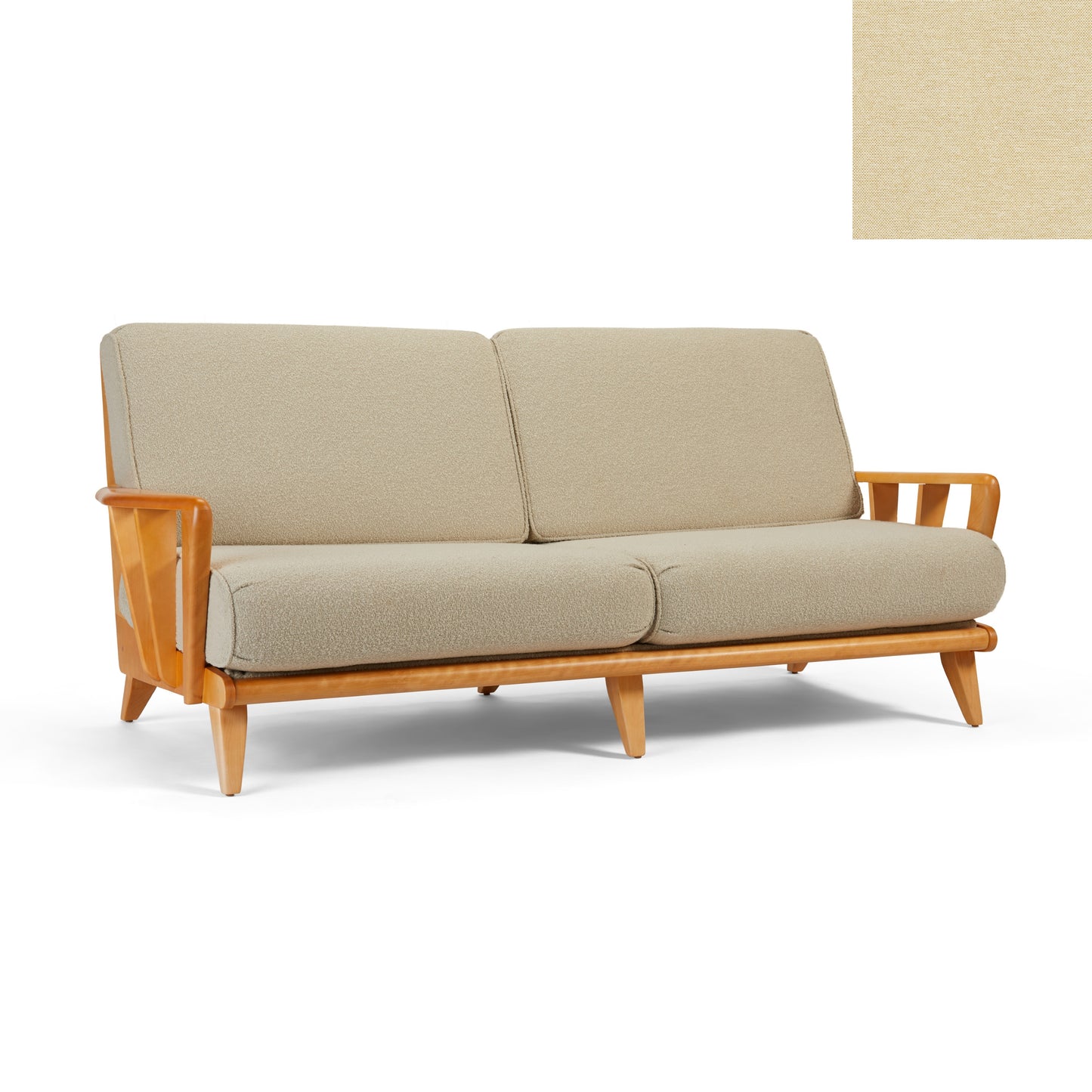 The Biscayne Davenport, shown here in our Amber finish and upholstered in Knoll Textiles Classic Boucle series Neutral color, was originally part of the Aristrocraft line, launched in 1950. It is built from 100% northern yellow birch wood and hand-assembled in our Massachusetts factory.