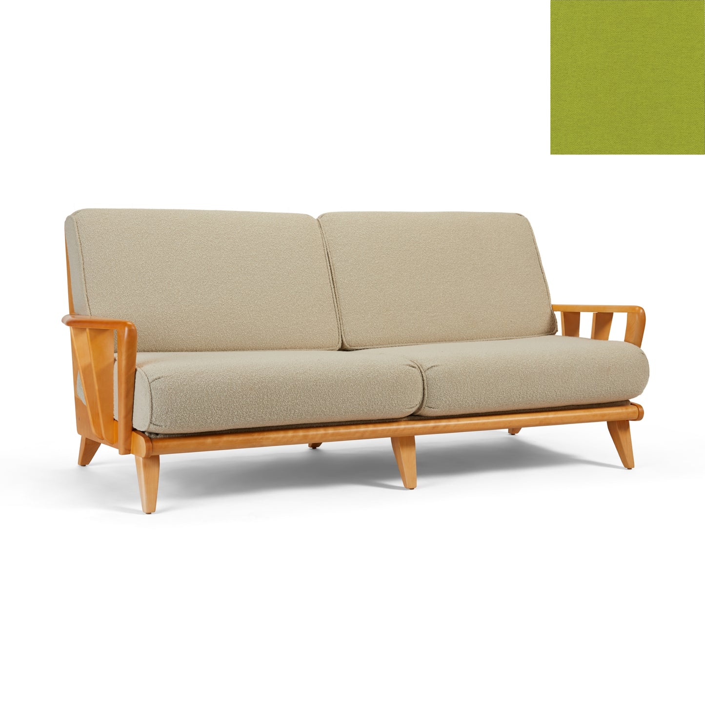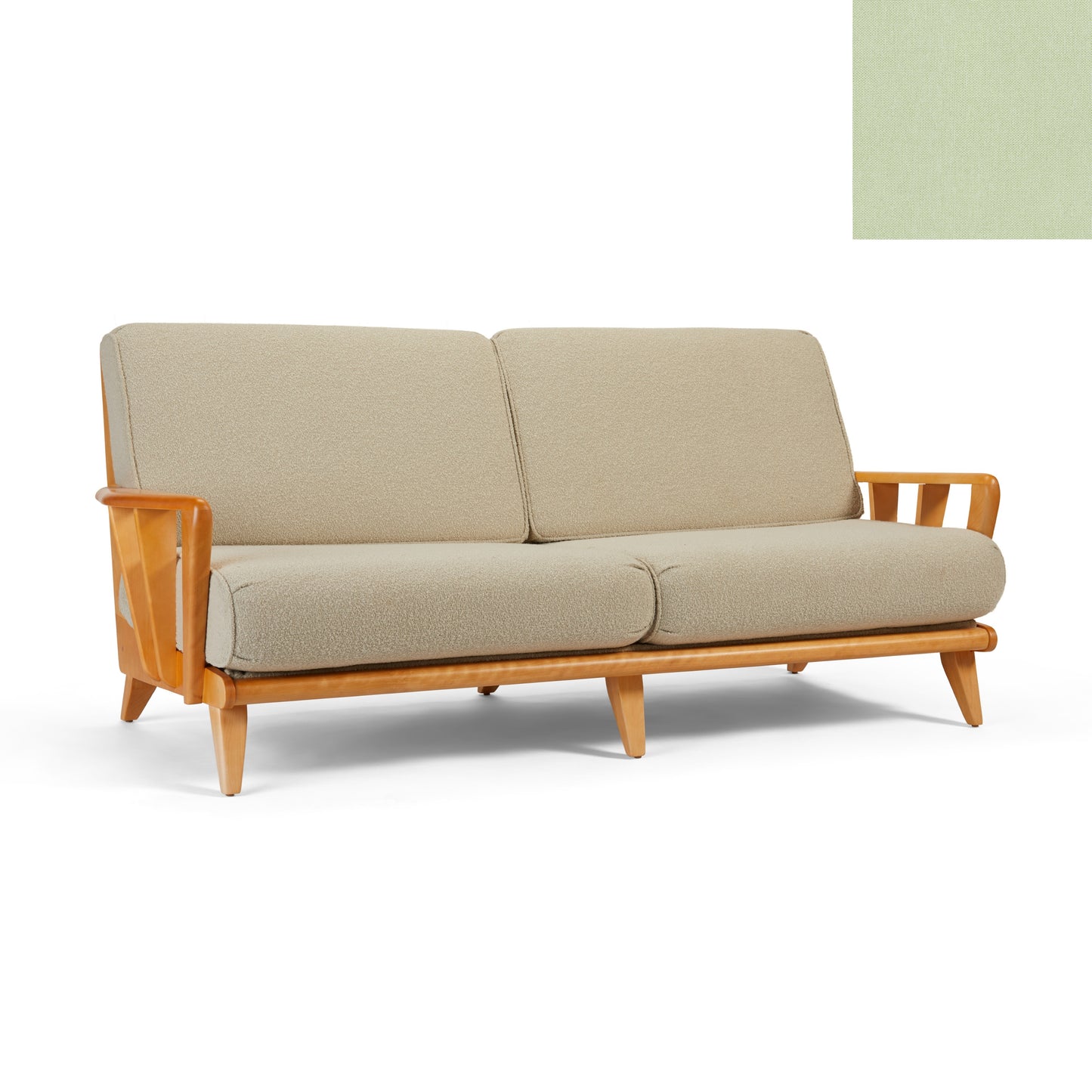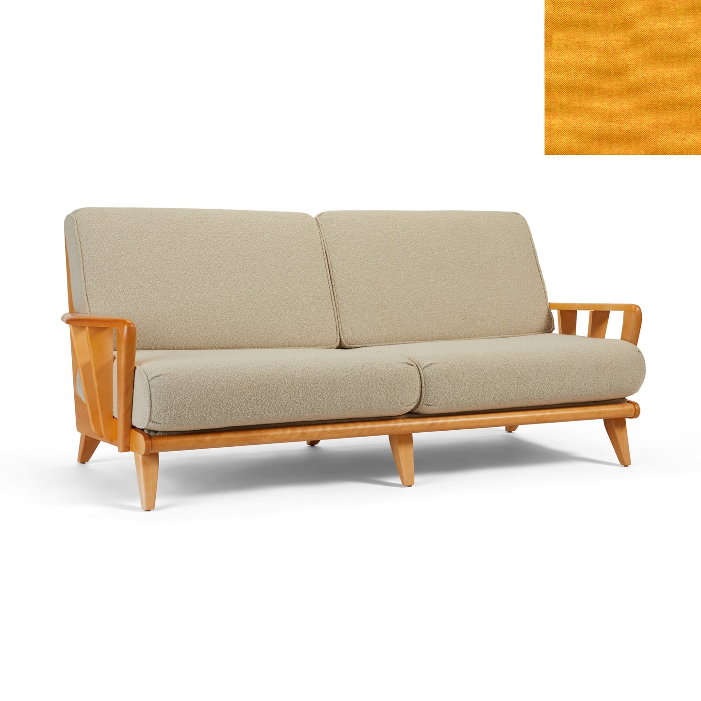 The Biscayne Davenport, shown here in our Amber finish and upholstered in Knoll Textiles Classic Boucle series Neutral color, was originally part of the Aristrocraft line, launched in 1950. It is built from 100% northern yellow birch wood and hand-assembled in our Massachusetts factory.