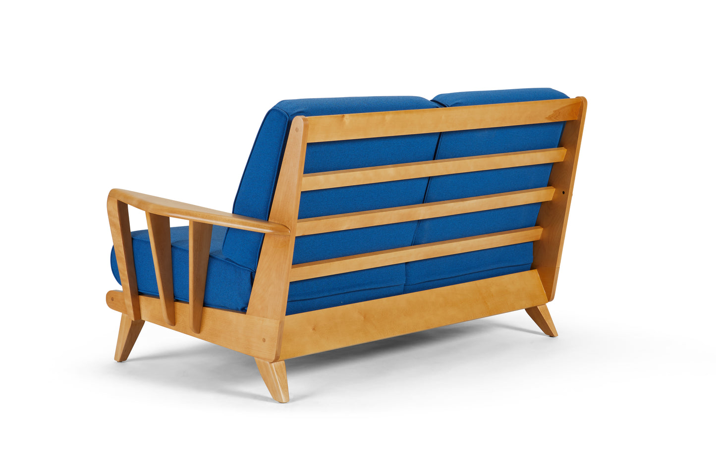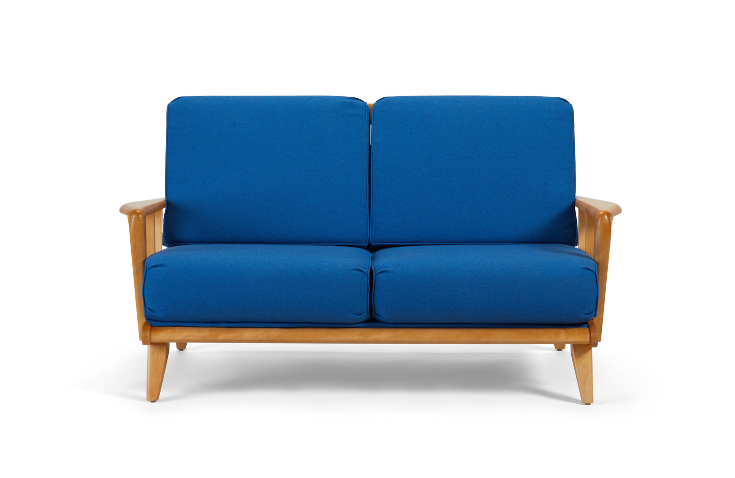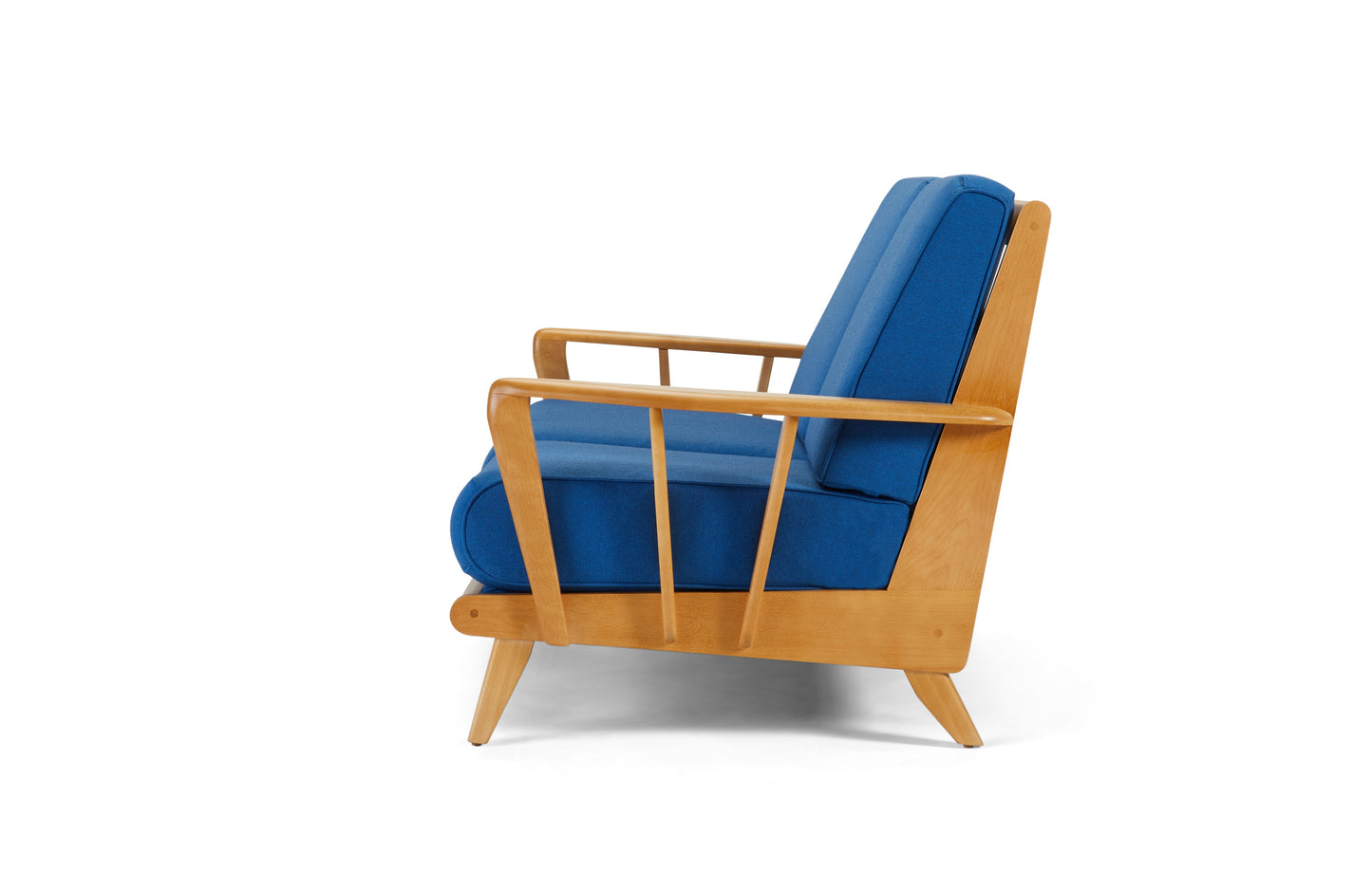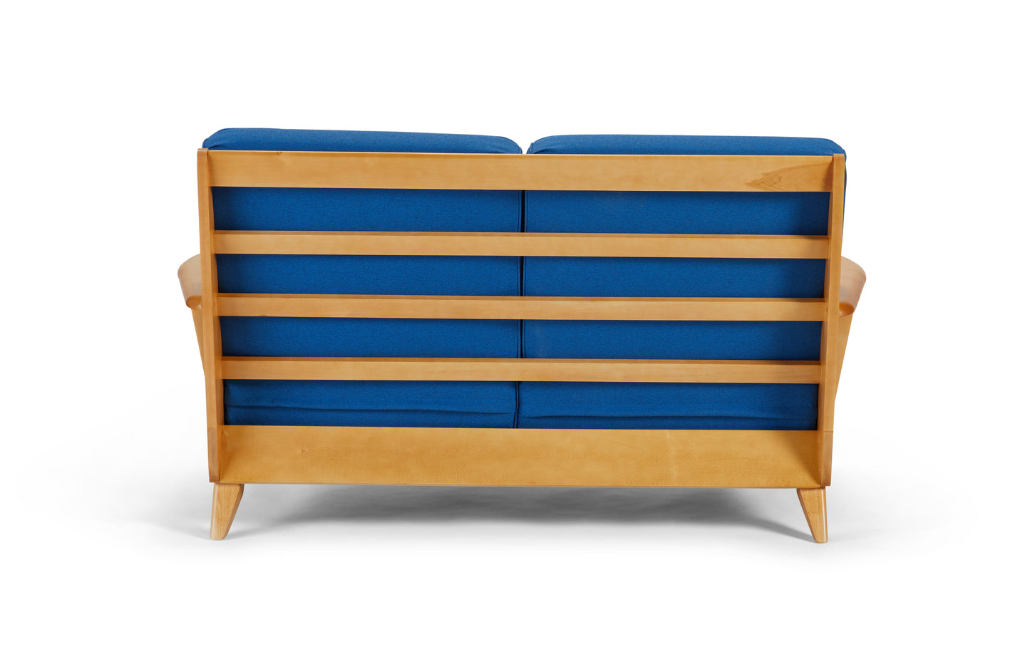 Regular price $3,892Originally part of the Aristrocraft line launched in 1950, our Biscayne Series Love Seat is shown here in our Amber finish and upholstered in the Knoll Textiles Crossroads series Ocean color.  It's built from 100% northern yellow birch wood and hand-assembled in our Massachusetts factory.