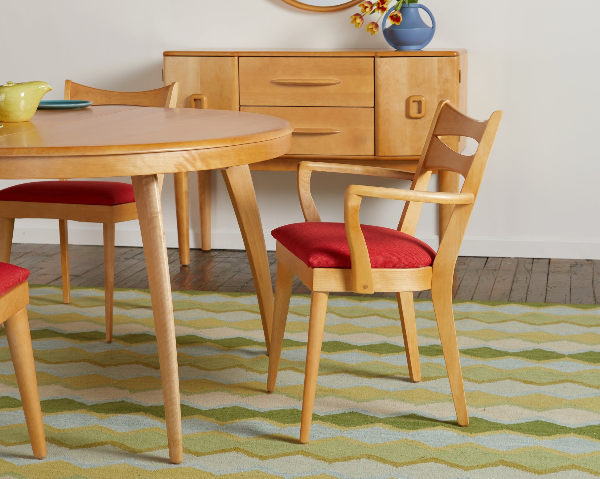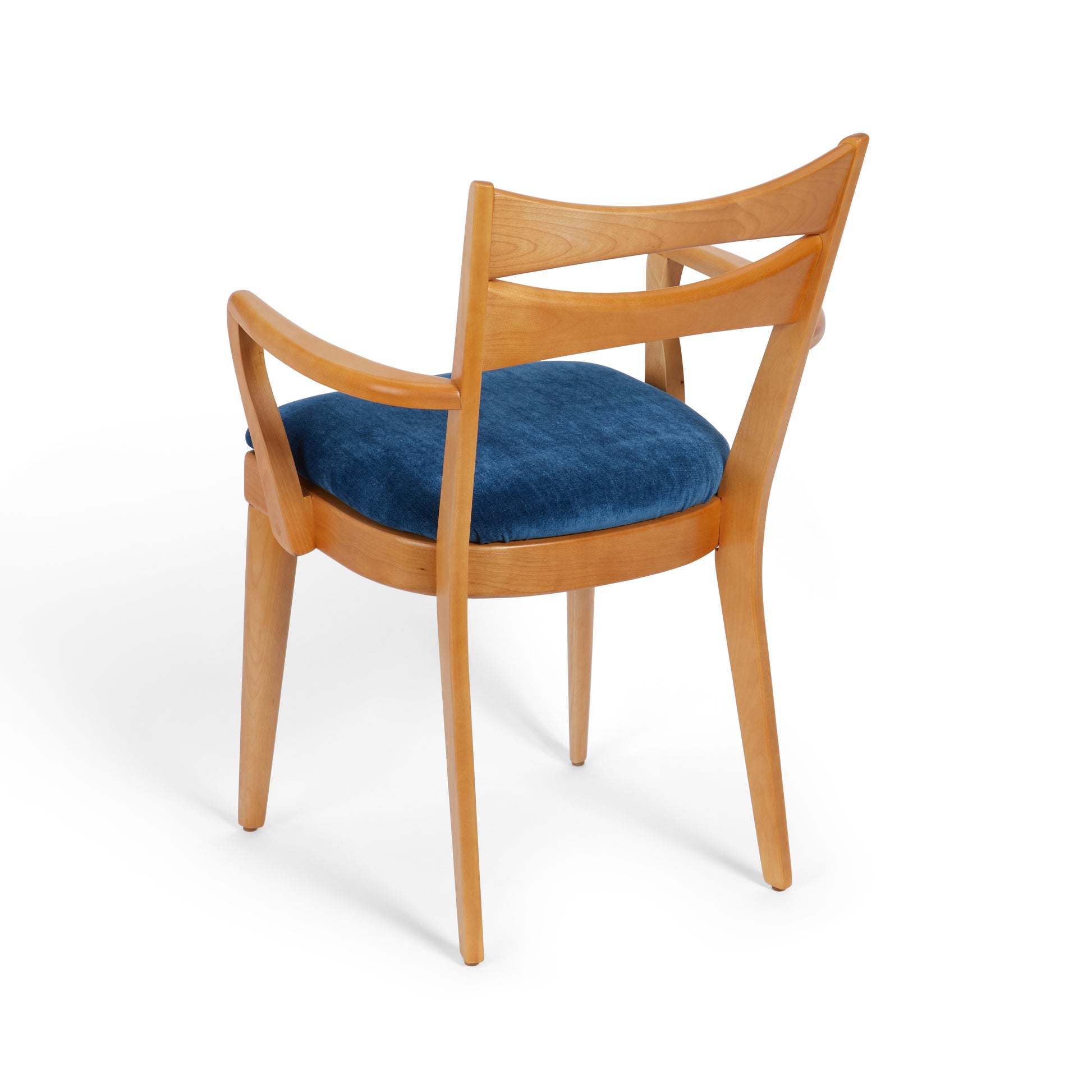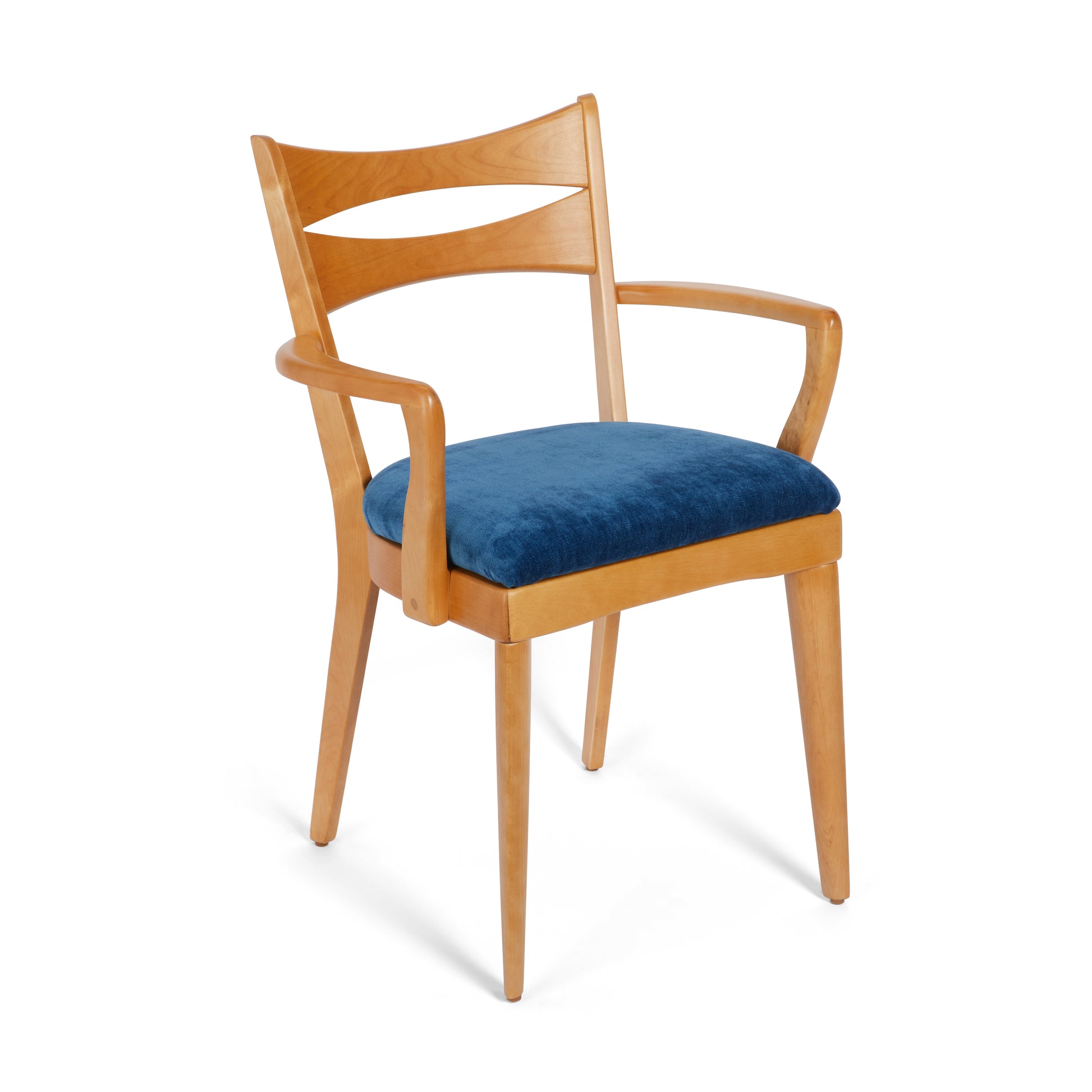 Shown here in our Nile Blue fabric, the M 1553 C “Cat’s Eye” Dining Arm Chair conveys a playful elegance that perfectly embodies the mid-century modern aesthetic and Heywood-Wakefield’s hallmark style. It achieves so much character from a deceptively simple design, as well as a versatility that makes it simultaneously well suited to family life, entertaining, and formal dining. It was originally produced from 1956 to 1966.