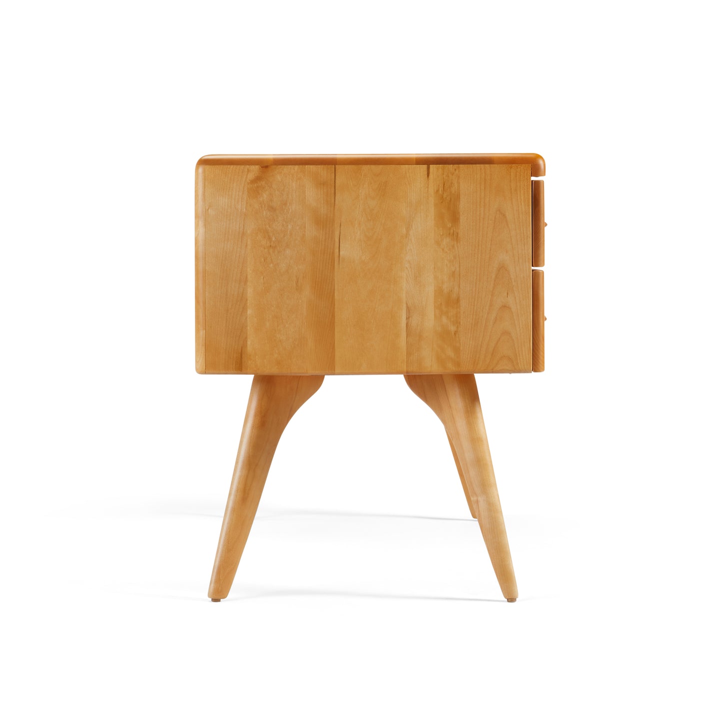 Shown here in our Amber finish, this mid-century modern model, first produced from 1954 to 1956, features four spacious, easily accessible drawers with attractively curved steam-bent fronts. Its simple, streamlined design provides a small footprint for versatile placement and ample leg room for your comfort.