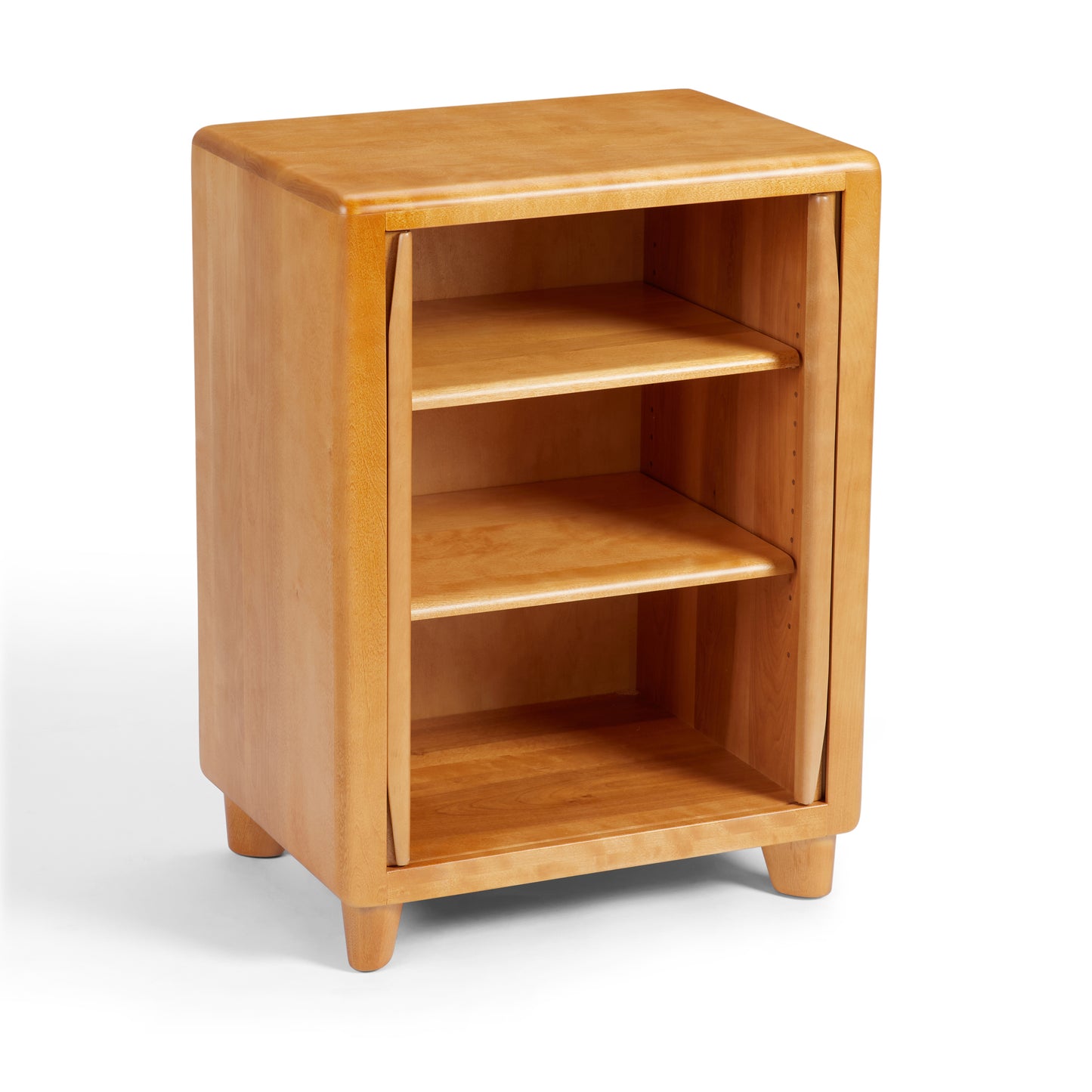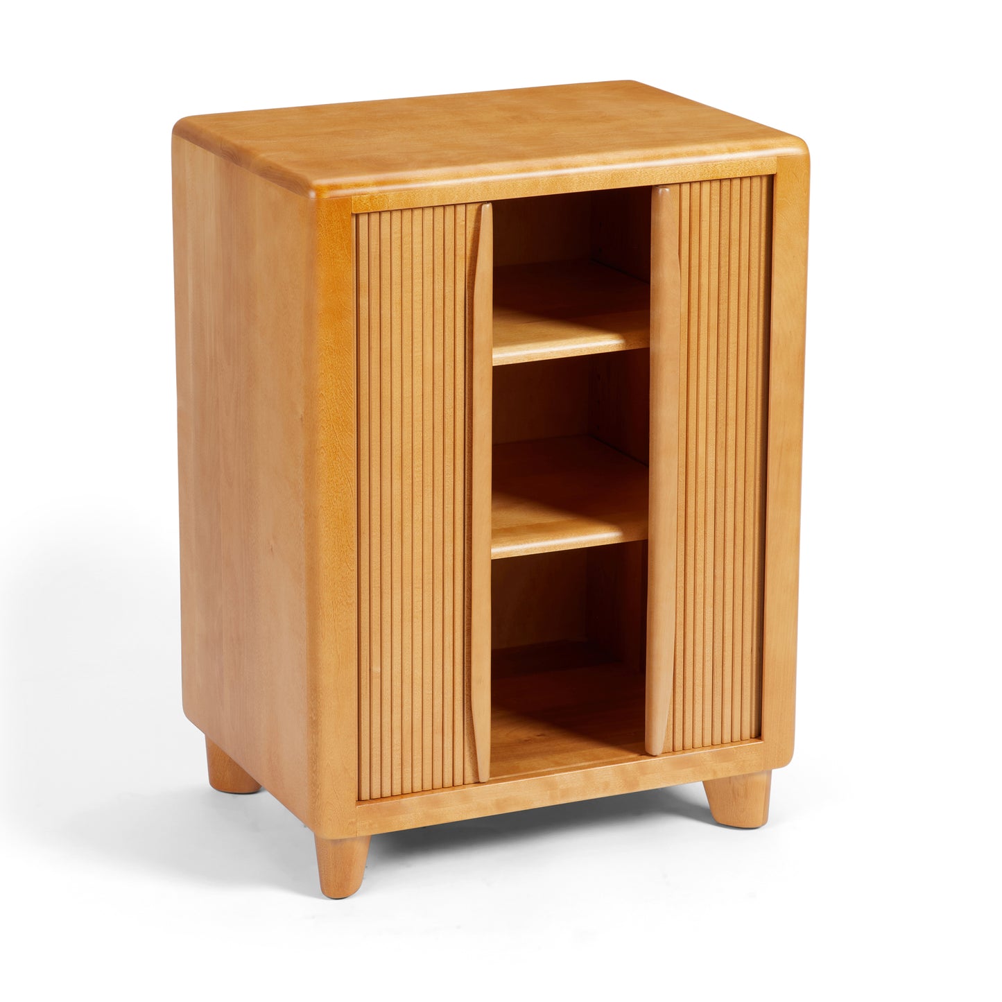 Shown here in our Amber finish, this chic organization piece adds a touch of retro flair to any room. “Tambour” refers to its special doors, made of narrow wood slats that curve so the doors disappear into the sides of the cabinet as they glide smoothly open from the center.